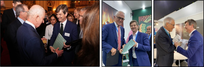 Rob Miller, AIA co-lead, presenting the report to (L-R) HM King Charles III in Buckingham Palace, Malcom Turnbull, Former Australian Prime Minister and Chair of the Green Hydrogen Organisation and Lord Adair Turner, Chairman of Energy Transitions Commission.